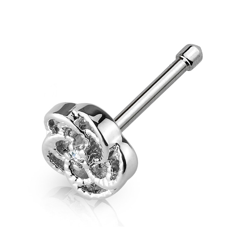 The rose has approximately 1/4" (6 mm) in diameter, so when you put it in your nose, it's clearly visible with all the details. On the other edge of the stud, there's a small ball, slightly thicker than the bar's diameter. The ball works as a protection so that the stud won't get out of place by accident. Despite all, it has the right size to be put on and off the piercing.