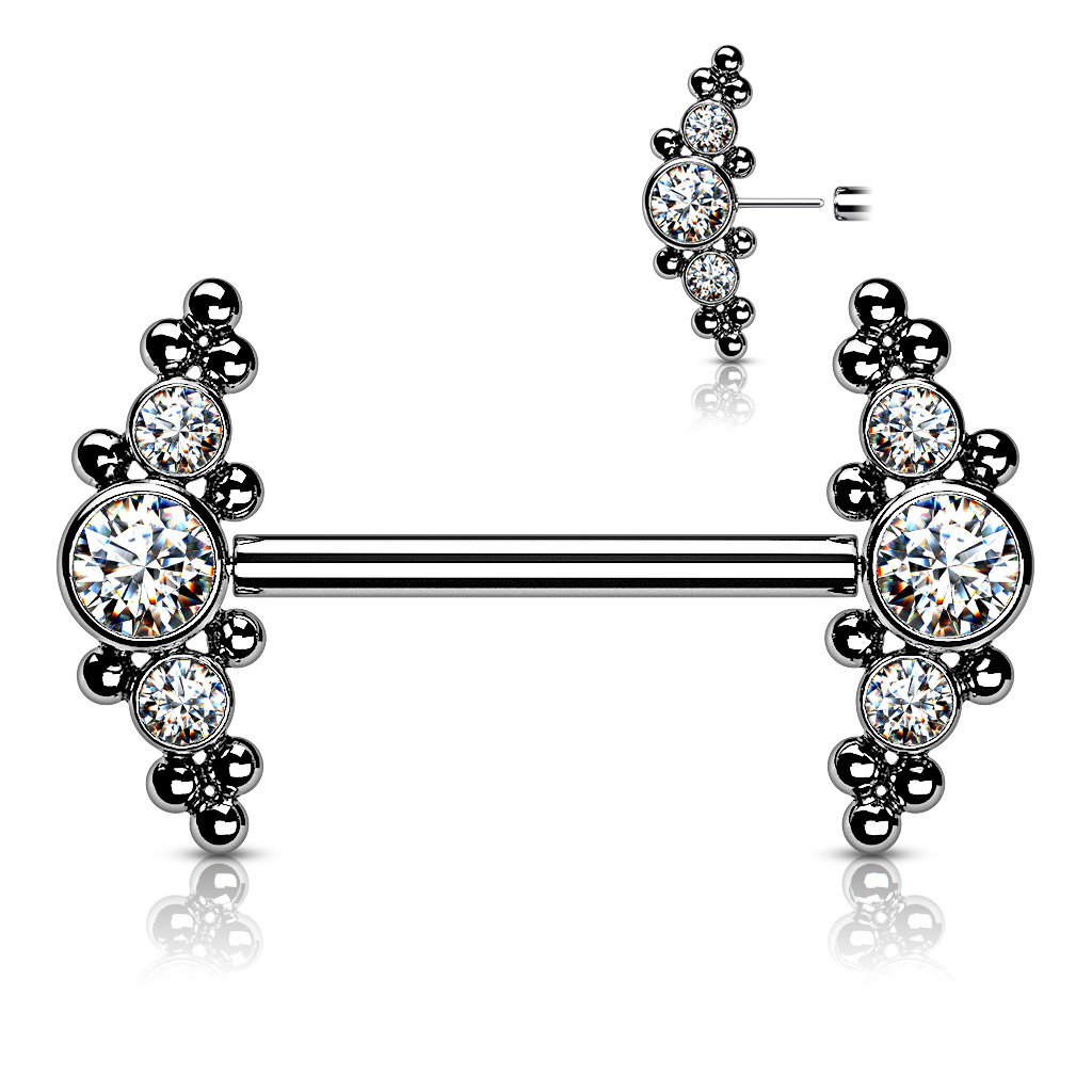 Quality, because the jewelry is made exclusively of titanium, both the bar and the cluster ends. They're clusters because they consist of a group of both rocks and small spheres. There's a bigger stone in the middle and two smaller ones next to it. The small spheres are mounted on the stones, making the whole piece of jewelry look like a cluster of stones and balls. The stones are mounted on the steel, which is flat at the back. Thus, the jewelry settles on your breast, depending on where exactly the piercing was made on your nipple.