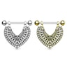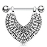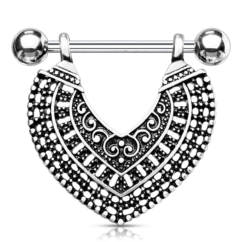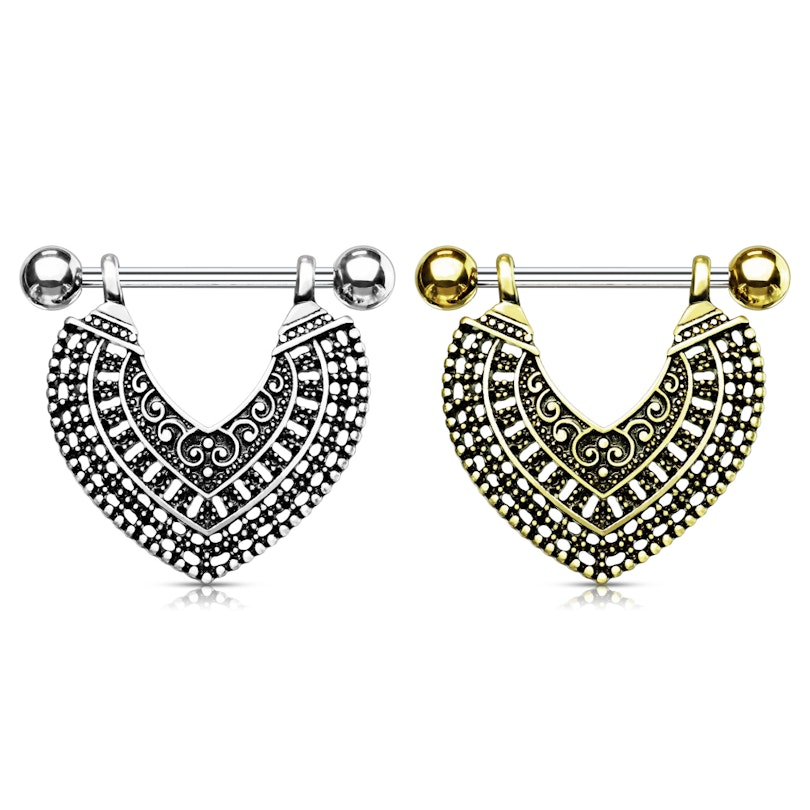 This nipple barbell is made of surgical steel, while the dangle is brass. The dangle and the end balls are layered with a silver or gold color finish, depending on the model you select. The dangle has beautiful shapes that remind of antique civilization decorations.