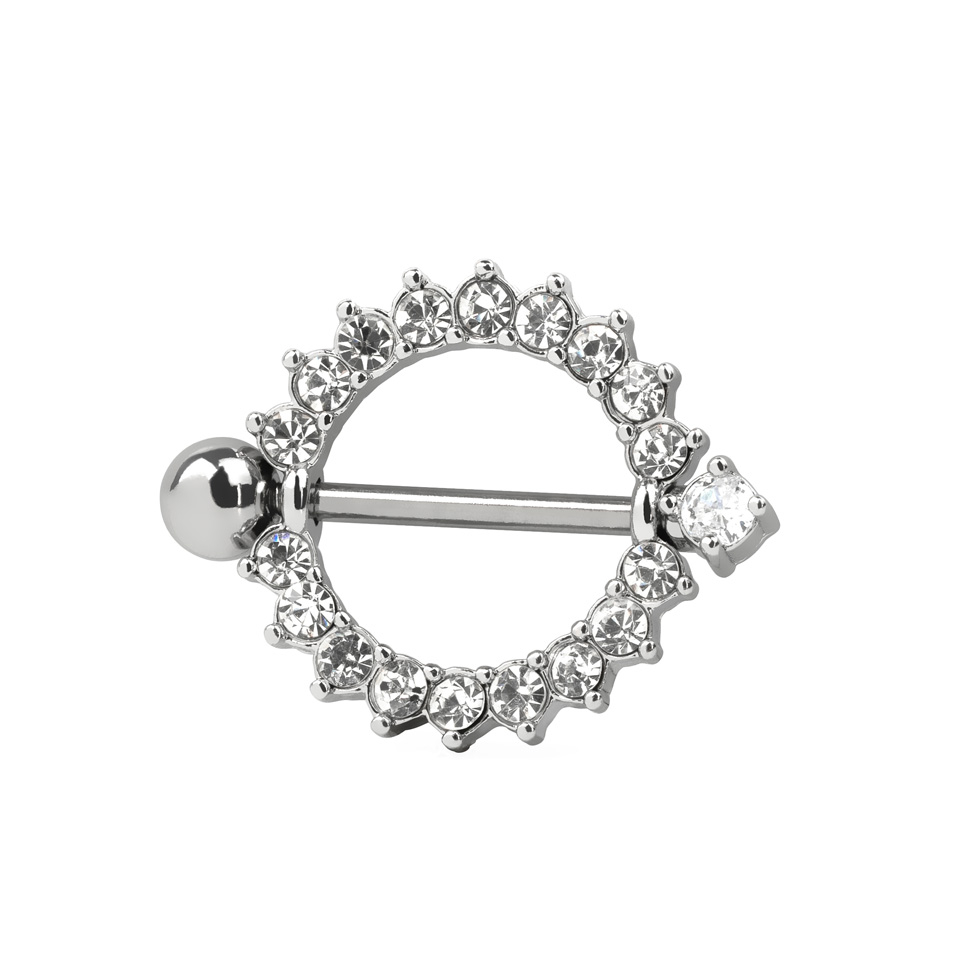 This beautiful nipple piercing ring has an elegant shield completely studded with clear stones that look like diamonds along the circle. It's worthy of a Goddess, a barbell that will make you feel like Cleopatra herself.
