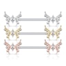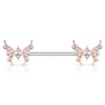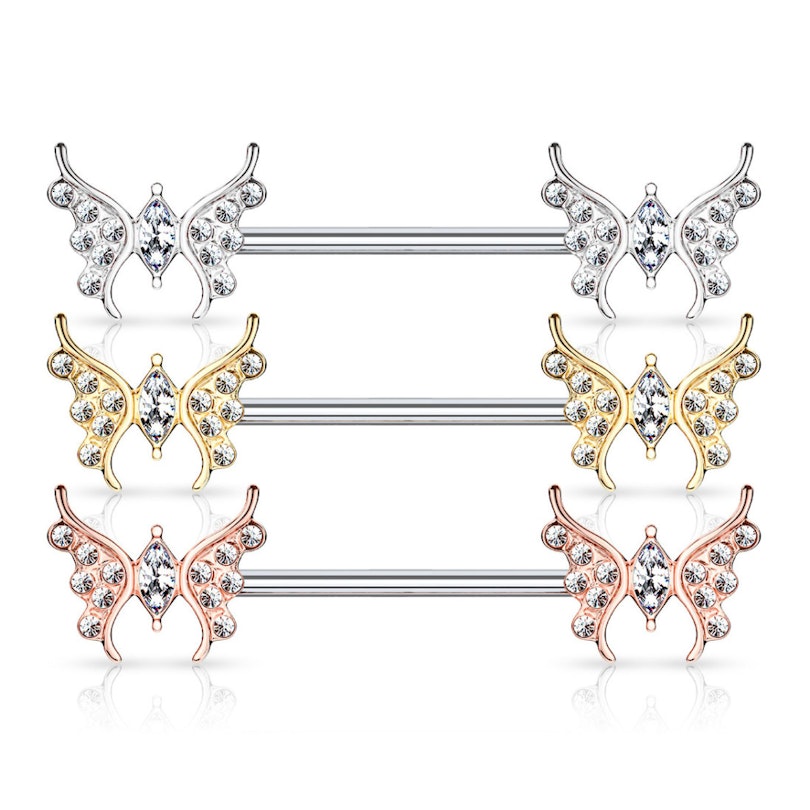 If you're looking for the most special designs for your nipple piercing, we have a beautiful offer. The jewelry consists of a 11/16" (17 mm) straight barbell. At each end sits a small butterfly with beautiful wings. The body of the butterfly has been studded with a small marquise-shaped stone, which actually follows the body shape really well. The wings are studded with little clear stones that match the larger stone in the middle.
