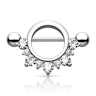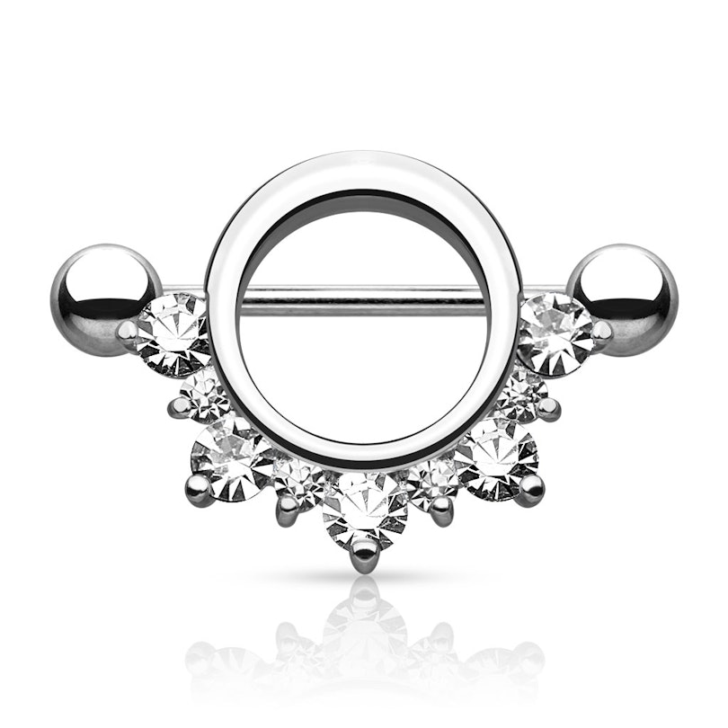 The bottom part features round stones, available in different colors. The arch contains five big gems and five smaller ones, arranged alternatively. The smaller ones are all white, but the bigger ones are available in different colors. You can choose the classic model, in which all the stones are white. But if you want to give your nipple a colorful touch, you can combine white gems with red, pink, or turquoise colors.