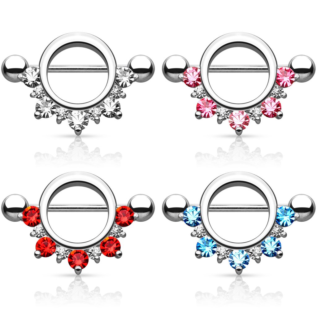 The bottom part features round stones, available in different colors. The arch contains five big gems and five smaller ones, arranged alternatively. The smaller ones are all white, but the bigger ones are available in different colors. You can choose the classic model, in which all the stones are white. But if you want to give your nipple a colorful touch, you can combine white gems with red, pink, or turquoise colors.