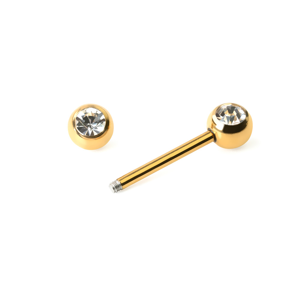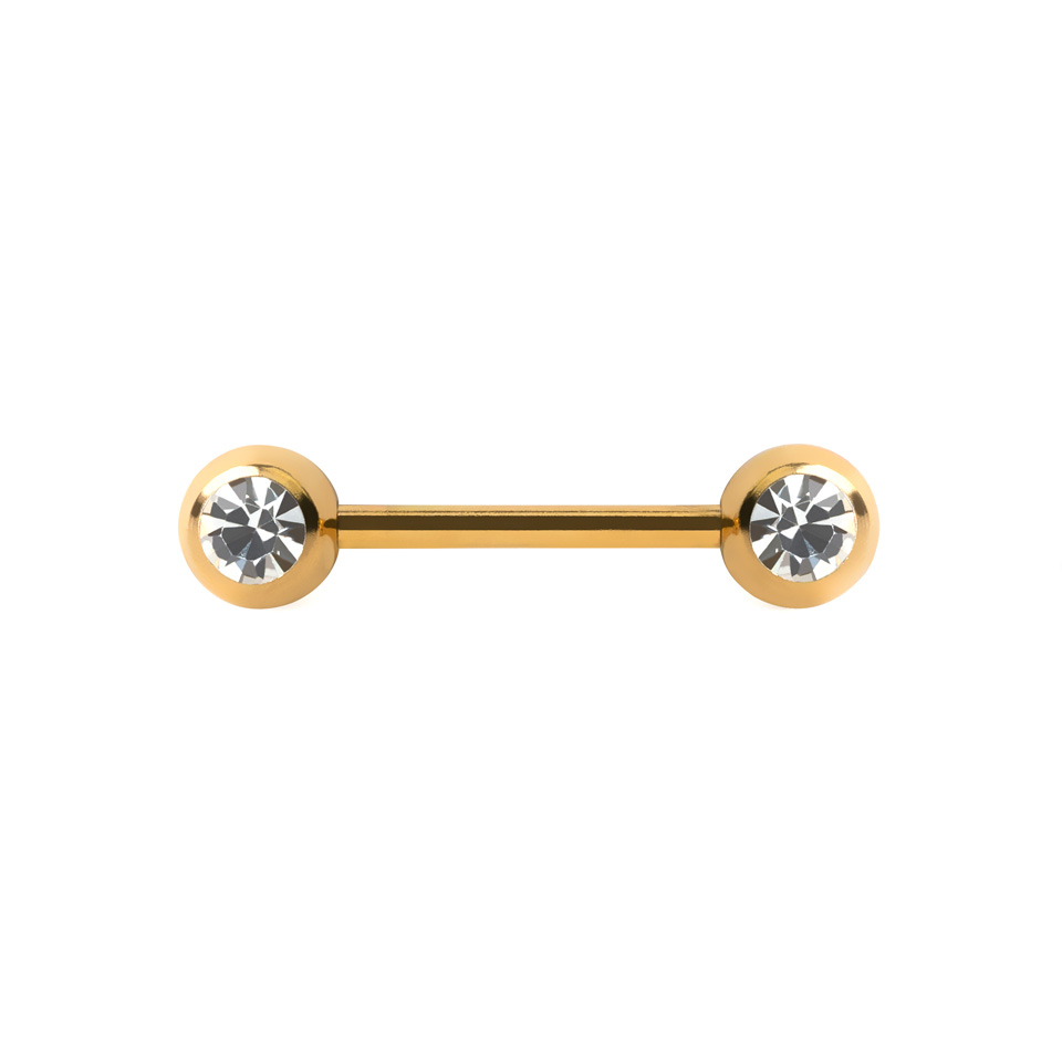 The barbell has two large end balls of 1/4" (6 mm). It's not a discreet nipple piercing, because the balls will catch the eyes of anyone who can see them. Besides, the balls hold a bezel-set crystal gem. The round stones have a diamond cut, so they will shine bright when light reaches them.