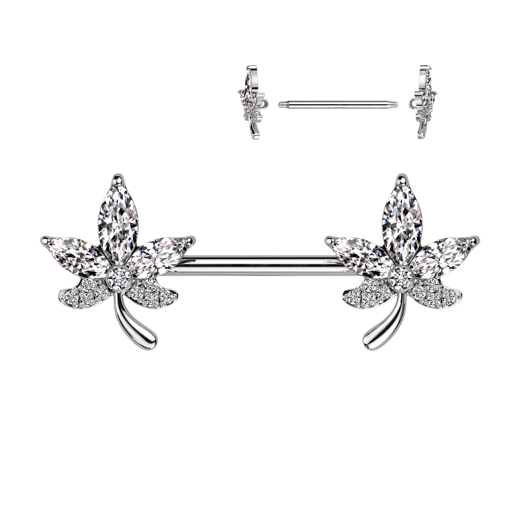 This jewelry is a sparkling nipple barbell with leaves bedazzled in shiny stones.