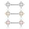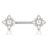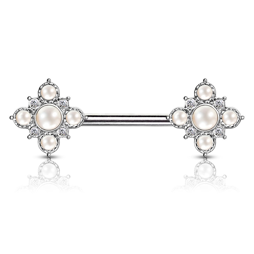Šiame paveiksliuke matai nuostabų auskarą į spenelį. Auskaro strypas yra pagamintas iš chirurginio plieno, atstumas tarp dekoracijų yra maždaug 12mm. Kiekvienas šią dekoraciją mato skirtingai, bet mes manome, kad tai yra gėlė. Gėlės viduje rasi didesnį perlą, dar keturi perliukai imituoja žiedlapius. Tarp žiedlapių taip rasi skaidrius kristalus.