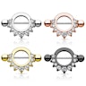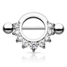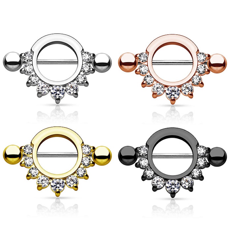 It's about time you pamper your nipple piercing with new beautiful jewelry. This nipple shield includes a straight barbell behind it. In the front, the shield holds nine beautiful stones that create a half-moon on the bottom.