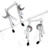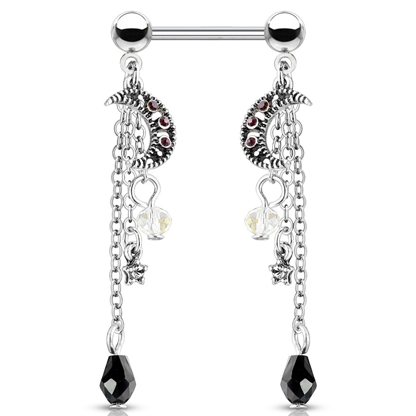 The nipple barbell you can see in the picture above features a galactic beauty. It contains two moons, stars, and little carved stones that look like meteors. All the pieces hang loose in small chains from the end balls at each end of the barbell. The bar is 9/16" (14 mm) long and made in surgical steel.