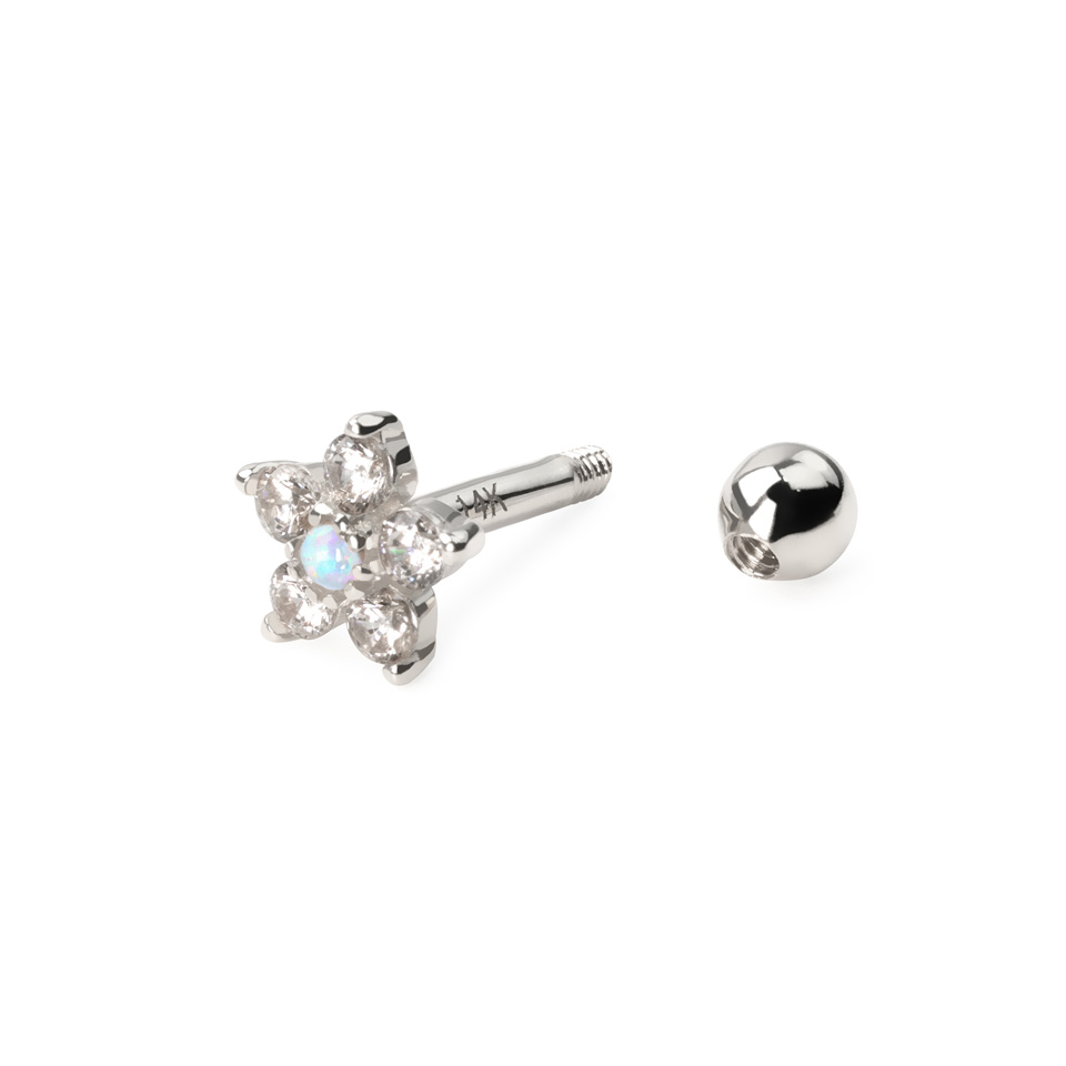 The top charm features a flower with a synthetic opal stone in the center, surrounded by five clear stones. These stones enhance and make the opal stand out even more. The stud as a whole is a fantastic eye-catcher and will undoubtedly decorate any ear it's pinned in.