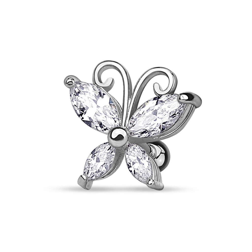 It's hard not to fall in love with these beautiful butterflies, primarily because of their detailed design. The butterfly in this ear piercing has beautiful and broad wings, made of oblong stones. The stones on the top wings are slightly bigger than the lower ones, just like real butterfly wings.