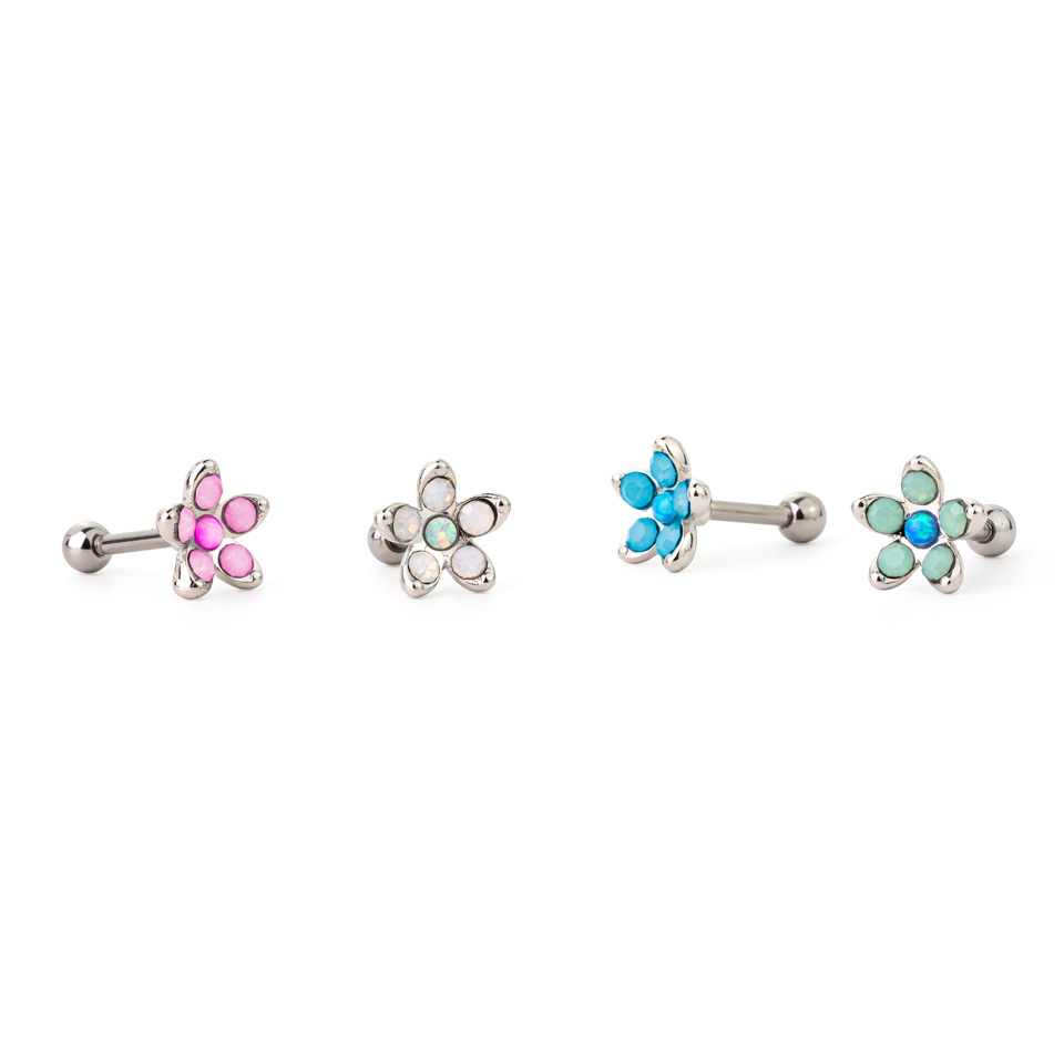 The barbell is made of surgical steel, and the flower charm is brass but has been coated with rhodium to get a glossy finish. The flower is made up of five opalites, which stand for petals, and one beautiful opal in the center.