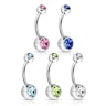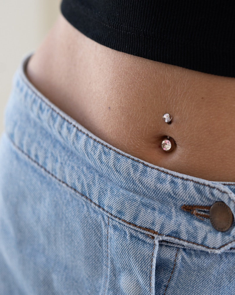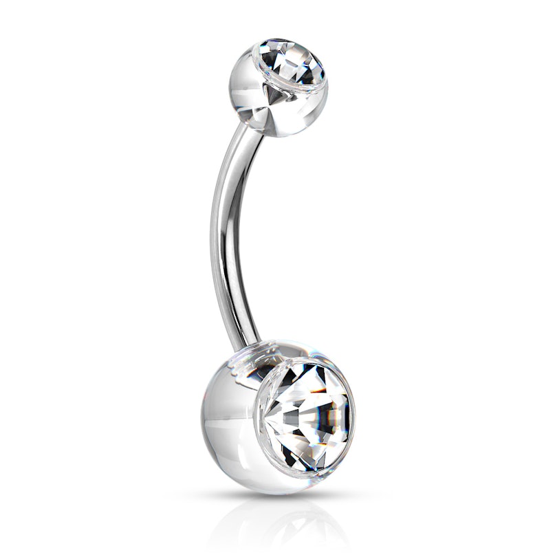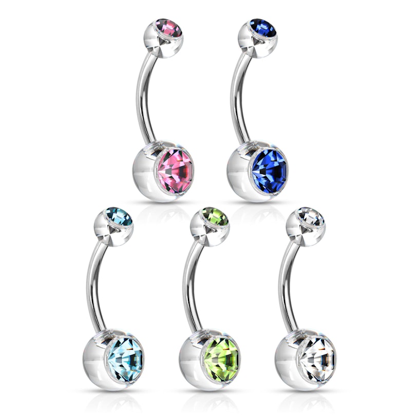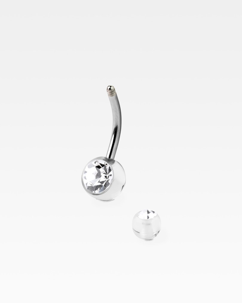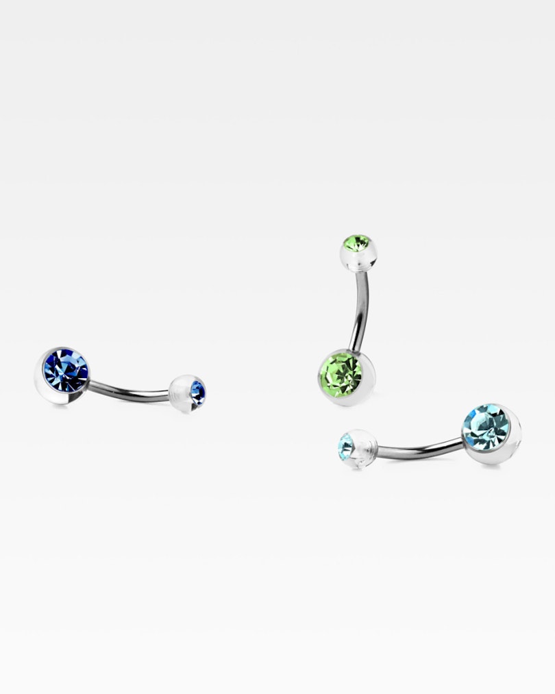 This is a simple but beautiful belly ring to wear every day at a very competitive price. The barbell is made of surgical steel, and the top and bottom balls are made of acrylic. Both have a bezel-set stone that you can get in five different colors. If you select the white one, you will get a classic style. If you want a more daring color, get one that looks great in contrast with your skin.
