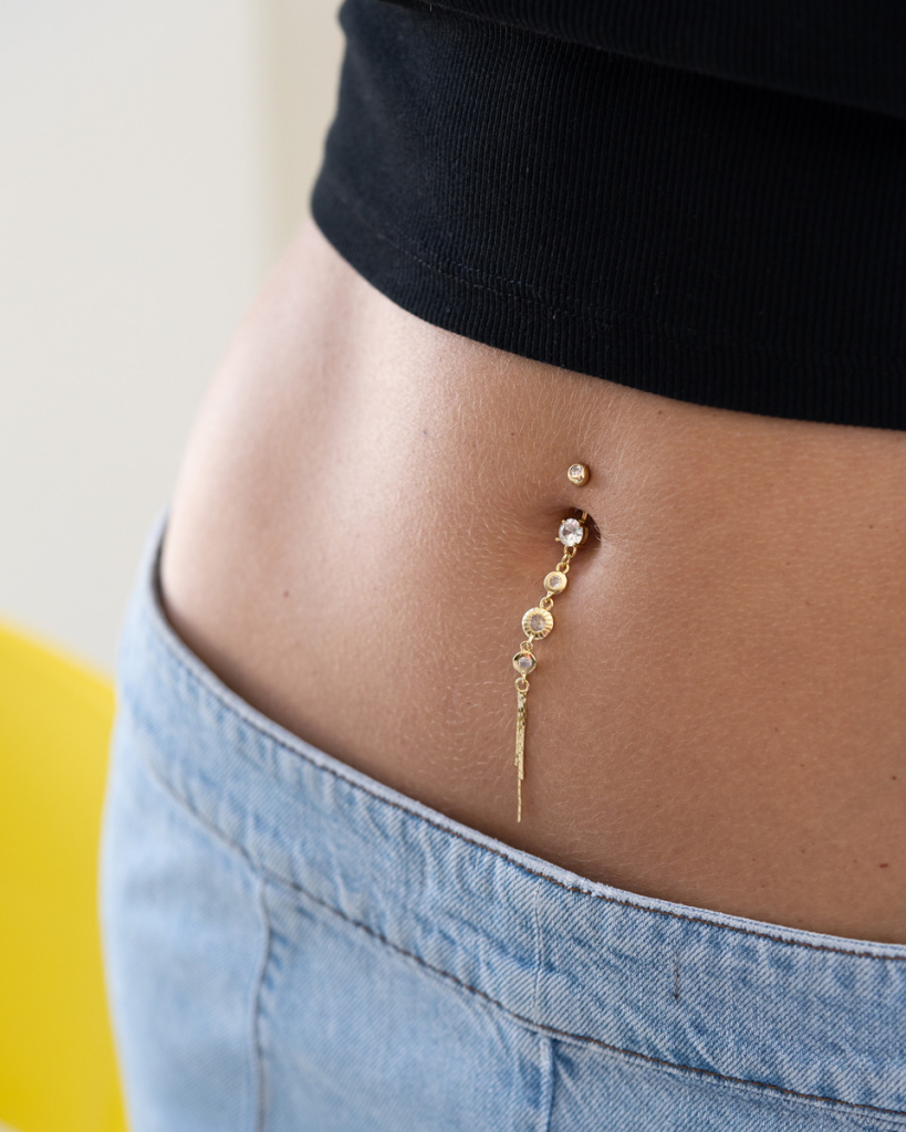 If you need an elegant belly button ring, you will love this model. This belly button ring has a clear stone on the top ball, and three more stones hang from the dangle. Besides, under the stones, the dangle has three thin chains below it, making it stand out and capture everybody's gaze.