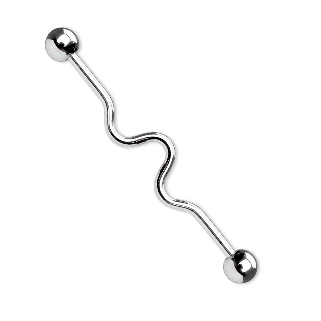 Magnific industrial barbell with a wavy bar, available in a variety of fabulous colors. This barbell looks spectacular on ear piercings. To put it on, unscrew both of the balls at the end of the barbell. Then, slide the barbell through your piercing holes. Once in place, all you have to do is screw the balls into the barbell tightly again.
