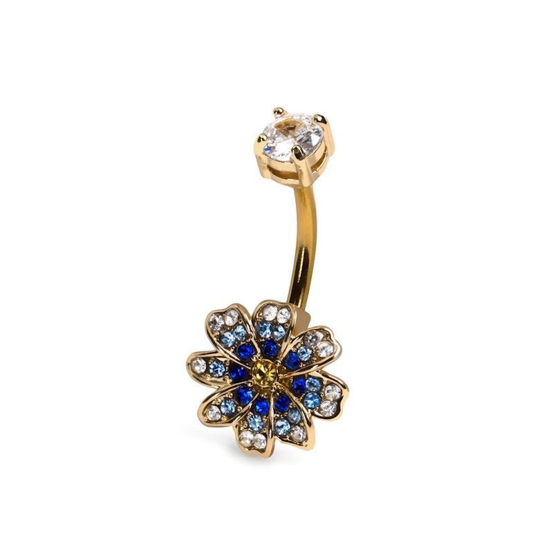 Šis mielas barbell į bambą sukurtas kaip tik trumpų marškinėlių sezonui. Jis papuoštas gėlyte iš mažų įvairių mėlynos spalvos atspalvių akmenėlių ir geltona akute per vidurį. Viršutinis rutuliukas turi permatomą akmenėlį.