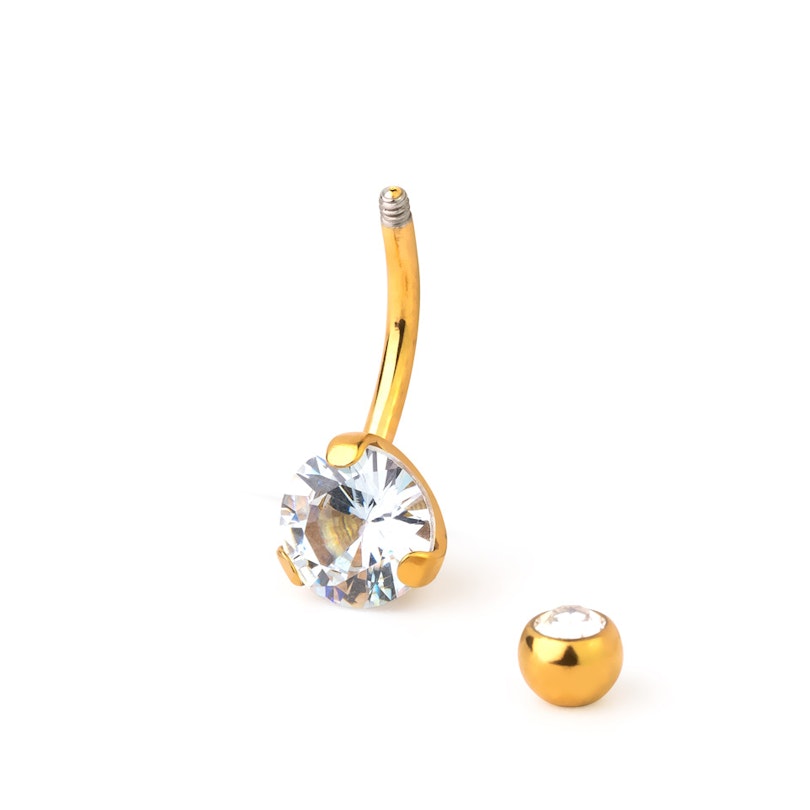 A gold-plated belly button ring is nothing new. But this is a different model because the barbell has three prongs on the bottom end that hold the large gem, making it look bigger. This method keeps large gems in place, with only three visible thin prongs.