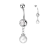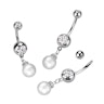 This beautiful belly ring features a twinkling stone in each ball and a pearl dangle with a decorative attachment that dangles elegantly from the bottom ball.