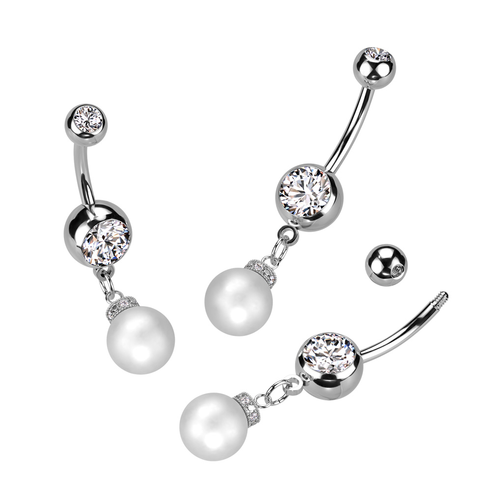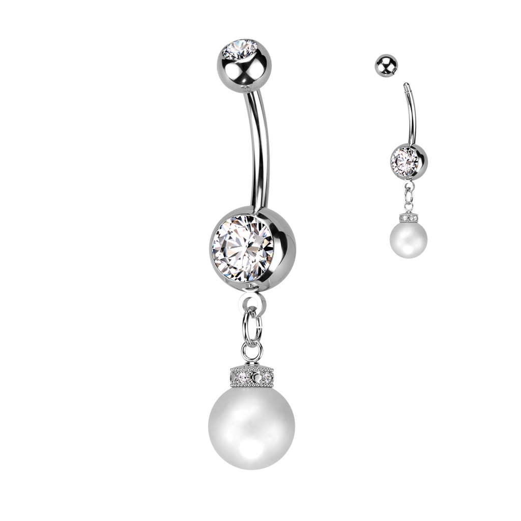 This beautiful belly ring features a twinkling stone in each ball and a pearl dangle with a decorative attachment that dangles elegantly from the bottom ball.