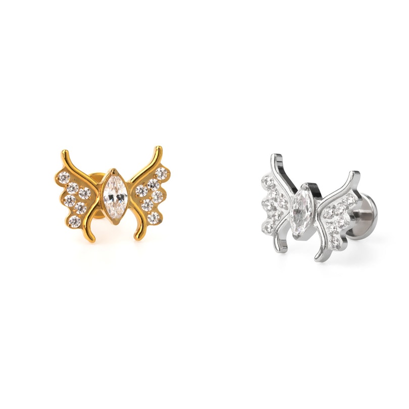This delightfully detailed labret is in the shape of a beautiful butterfly. The body is represented by a bezel set oval-shaped CZ stone, and the delicate wings are studded with 6 tiny stones. Made from titanium this piece is durable and hypoallergenic, and the internal thread means inserting and removing it from your piercing is really easy and comfortable. This butterfly will be a charming addition to your ear arrangement.
