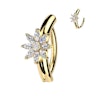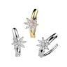 Šio stilingo clicker tipo žiedinio bambos auskaro centre – blizgi gėlytė. Gėlytė pagaminta iš 9 kubinio cirkonio akmenukų. Papuošalą galima įsigyti aukso arba sidabro spalvos.