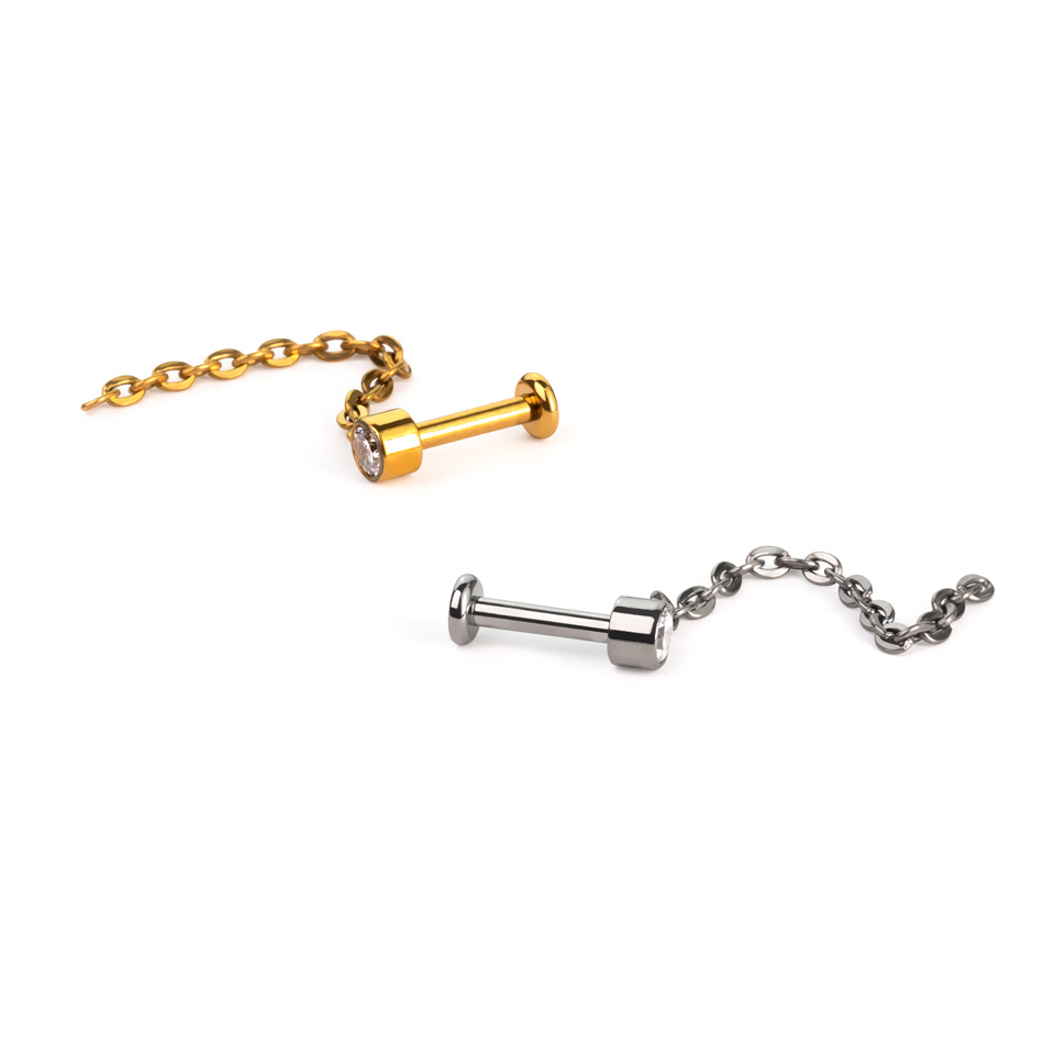 Pavadinimas: Dailus titano labret auskaras su kristalu ir grandinėle