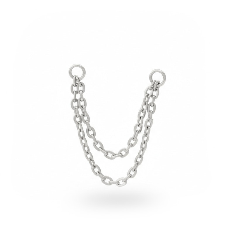 This piece of jewelry consists of two titanium chains connected at each end with an O ring, which can easily be attached to your piercing jewelry. For example, you could attach one end to a ring or a labret in your lobe piercing and the other to a ring or labret in your helix piercing. The options are endless!