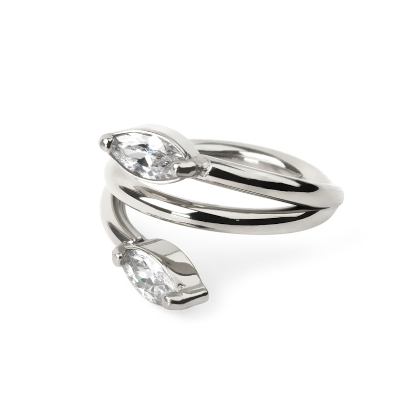 Delicate hinged ring in surgical steel. This beautiful ring features two marquise cut CZ stones which give the look of leaves on a vine. Available in a choice of 8 mm and 10 mm diameters and gold or silver finishes, this versatile piece will work beautifully in all types of ear piercings, particularly cartilage piercings such as the rook and helix.