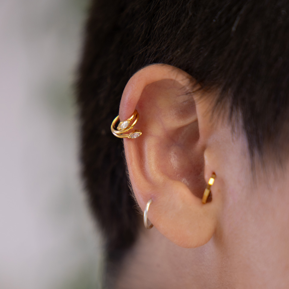 Delicate hinged ring in surgical steel. This beautiful ring features two marquise cut CZ stones which give the look of leaves on a vine. Available in a choice of 8 mm and 10 mm diameters and gold or silver finishes, this versatile piece will work beautifully in all types of ear piercings, particularly cartilage piercings such as the rook and helix.