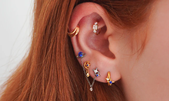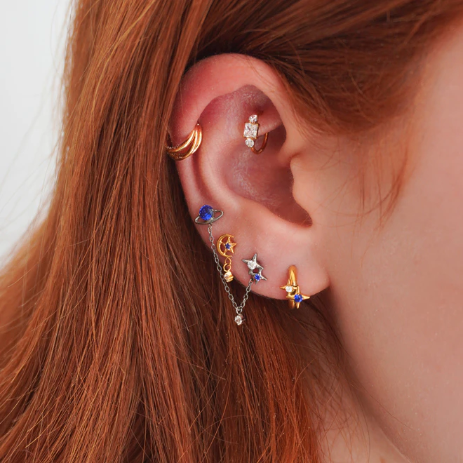 Vieta: Kaušelis, Helix, Vidinis kaušelis, Anti-tragus, Priekinis helix