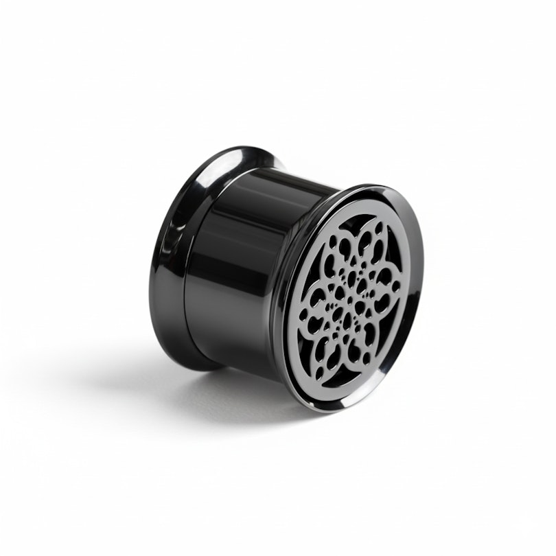 Filigrano tunelis suteikia elegantišką akcentą ištemptoms ausims. Priekyje puikuojasi detalus gėlių išpjovimas, jungiantis ryškų dizainą ir subtilų meistriškumą, todėl rezultatas tiek klasikinis, tiek šaunus.