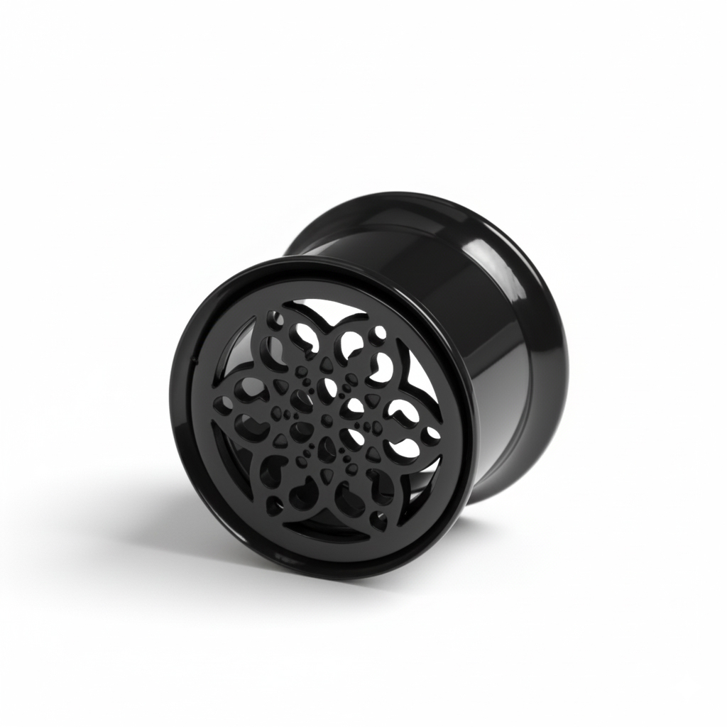 Filigrano tunelis suteikia elegantišką akcentą ištemptoms ausims. Priekyje puikuojasi detalus gėlių išpjovimas, jungiantis ryškų dizainą ir subtilų meistriškumą, todėl rezultatas tiek klasikinis, tiek šaunus.