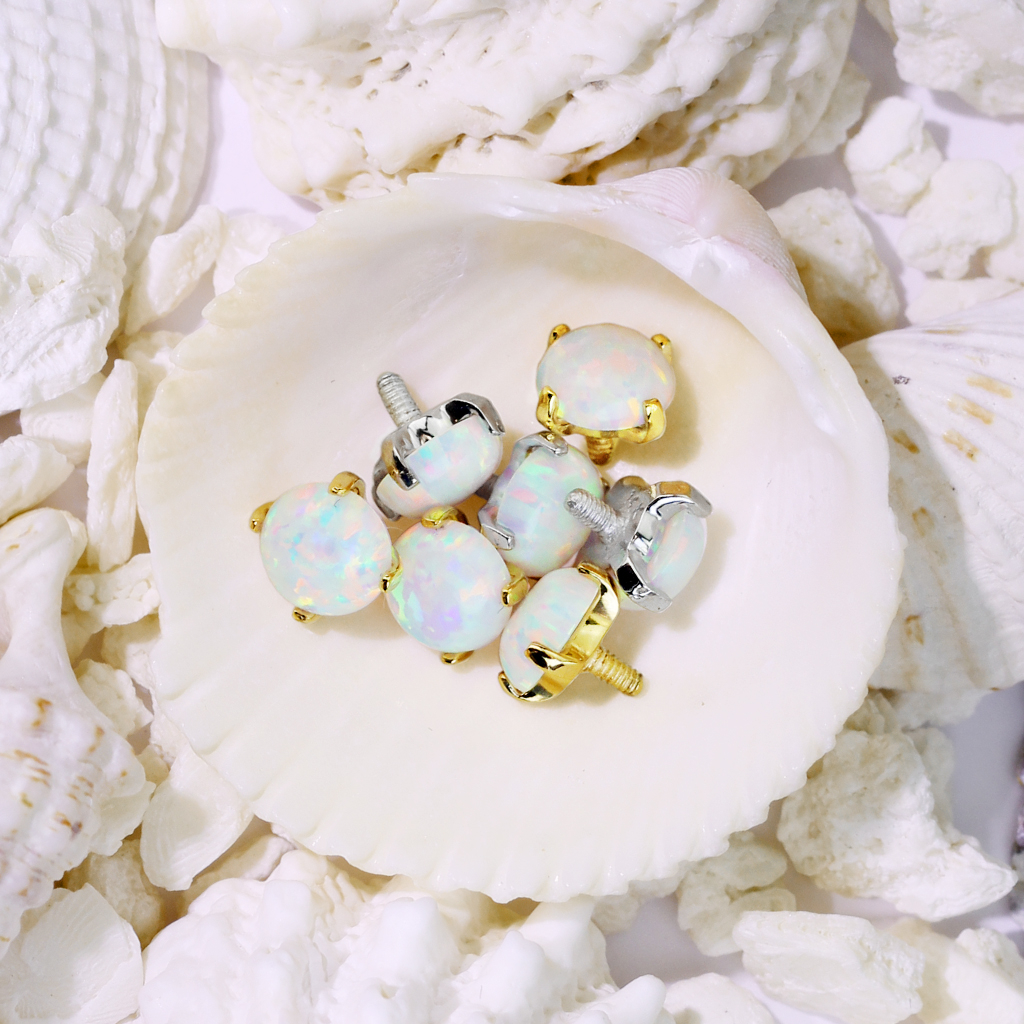 It features a beautiful 4-prong white opal stone, which is round, and it’s available in three different sizes: 1/8", 5/32", and 3/16" (3, 4, and 5 mm), depending on whether you want your jewelry to be more or less discrete.
