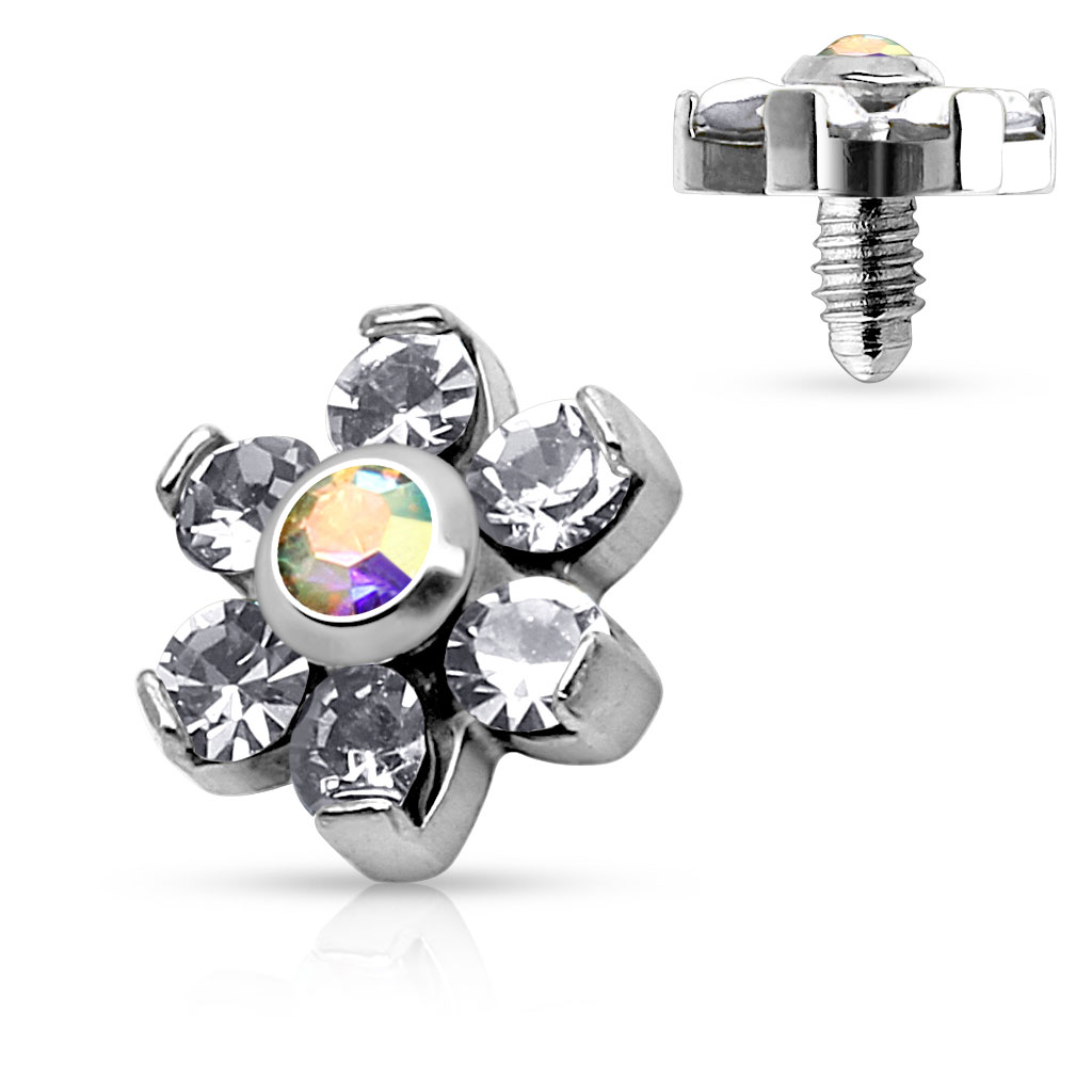 This fabulous top consists of a flower with six petals. Each one of them features a bright stone, and there is a larger one in the center of the flower. The outer stones are held in place by a prong setting.