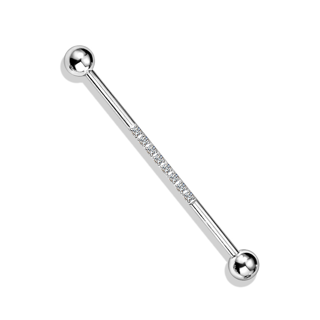 Turime nuostabų pasiūlymą tiems, kas turi industrinį pirsingą. Auskaras turi 2 kamuoliukus ir tiesų strypą su 8 mažais akmenukais. Strypas pagamintas iš chirurginio plieno ir prieinamas skirtingų spalvų. Taip pat gali pasirinkti akmenuką spalvą. Tačiau tik blizgančio sidabrinio modelio akmenukai gali būti skirtingų spalvų. Kiti modeliai papuošti skaidriais akmenukais.