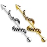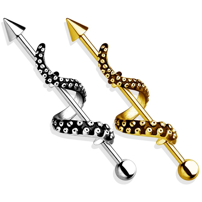 If you were looking for a unique barbell for your industrial piercing, you are in the right place. This industrial barbell has the shape of an arrow, with an arrowhead on one end and a ball on the other. But the most interesting part is between the two. In the middle of the bar, there's an octopus tentacle. It's black and decorated from side to side.
