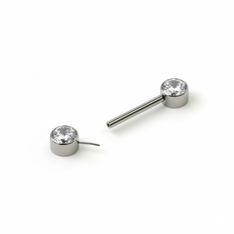 The nipple barbell you see here has neither a thread nor any other locking mechanism. It consists of a 9/16" (14 mm) long and 14g (1.6 mm) thick bar with a tiny 0.02" (0.55 mm) hole at each end. In that hole fits a small pin attached to a ball. The ball is flat on the back and is approximately 5/32" (4 mm) high and 1/4" (6 mm) in diameter. In the center of the sphere sits a stone available in one of several colors that you can choose from.