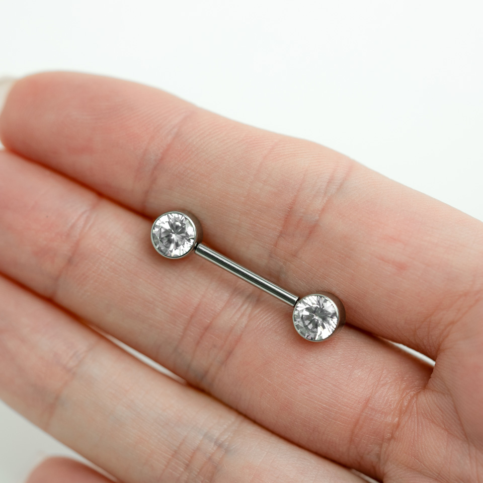 The nipple barbell you see here has neither a thread nor any other locking mechanism. It consists of a 9/16" (14 mm) long and 14g (1.6 mm) thick bar with a tiny 0.02" (0.55 mm) hole at each end. In that hole fits a small pin attached to a ball. The ball is flat on the back and is approximately 5/32" (4 mm) high and 1/4" (6 mm) in diameter. In the center of the sphere sits a stone available in one of several colors that you can choose from.