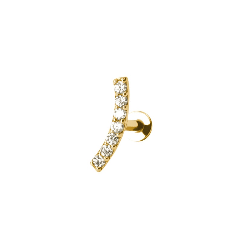 The labret is made of 14-karat gold and is available in two versions: yellow gold and white gold. You can also choose between a 1/4" (6 mm) or a 5/16" (8 mm) bar. The arched labret holds 7 zirconia stones that will sit perfectly in your helix, for example, thanks to the way they're arranged. Where you want to use your jewelry is of course entirely up to you -- be creative! This labret impresses with its elegance, which makes it a timeless piece of jewelry.