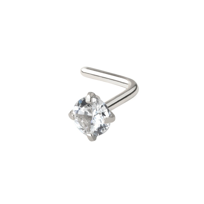 The stud is L-shaped, allowing a secure fitment without the risk of slipping out. The size of the bar is the same in all the models: a gauge of 20g (0.8 mm) and a length of 1/4" (6 mm). The size of the zirconia stone is about 1/8" (between 2.5 and 3 mm depending on the design). Lastly, it's worth mentioning that all of them are made of surgical steel.