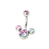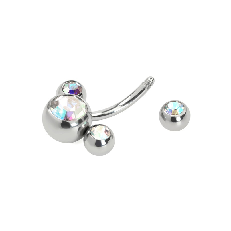 This belly button ring has a shape that everybody knows, at the end of a curved barbell of 3/8" (10 mm) and a top and bottom ball. The difference is that this barbell has two balls connected to the bottom ball. Besides, each ball has a colored stone, in beautiful colors you can choose from.