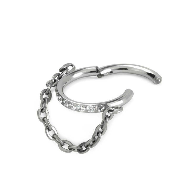 Titanium hinged ring featuring a row of delicate stones and a chain detail. The chain is attached at both sides, about halfway down to hang just a little below the bottom of the ring.