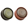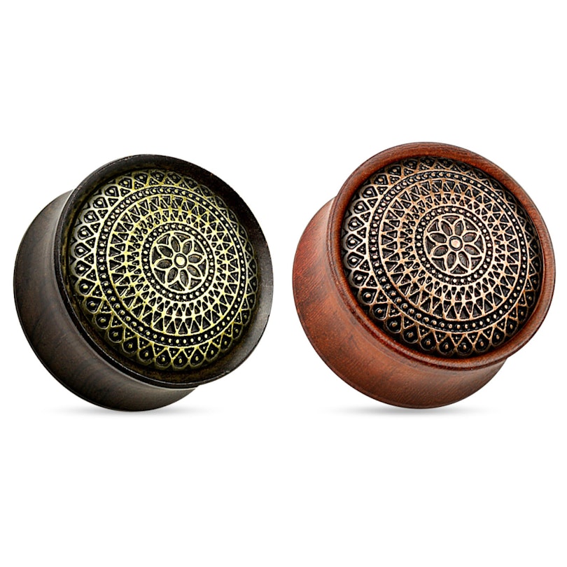 Organic material like wood allows the skin around your piercing to breathe even with jewelry, and thus, it also prevents bad smells. This plug is available in two types of wood. Choose between the reddish color of rosewood or the dark color of ebony. The front side of the plug is made of brass: in the rosewood model, the brass has a copper color, while the other model has a brass color. Both models contrast with the natural color of the wood. The golden pattern over the dark plug gives the jewelry a very antique look, while the reddish wood harmonizes with the brass motif.