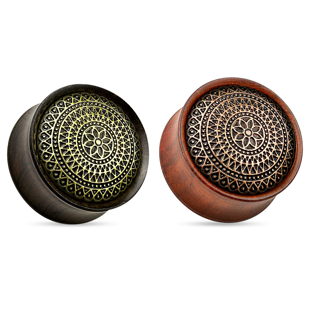 Organic material like wood allows the skin around your piercing to breathe even with jewelry, and thus, it also prevents bad smells. This plug is available in two types of wood. Choose between the reddish color of rosewood or the dark color of ebony. The front side of the plug is made of brass: in the rosewood model, the brass has a copper color, while the other model has a brass color. Both models contrast with the natural color of the wood. The golden pattern over the dark plug gives the jewelry a very antique look, while the reddish wood harmonizes with the brass motif.