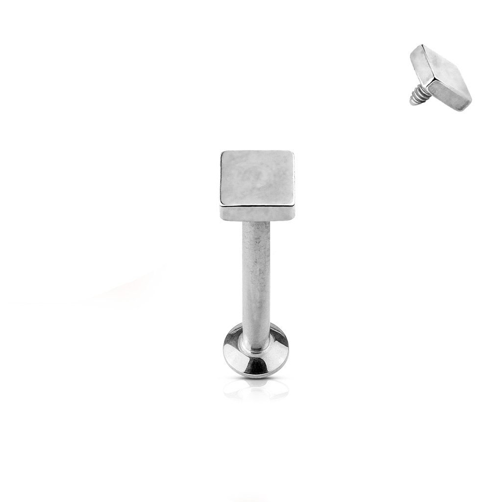 The jewelry we introduce here is a versatile labret that can be worn in many different body parts. It's primarily for lip piercings, where the post is inserted from the inside and out and a small square top - which is moreover 1/8x1/8" (3x3 mm) - is screwed into the post. The bottom disc also has a diameter of 1/8" (3 mm) and stays inside of the lip while the square top remains outside.