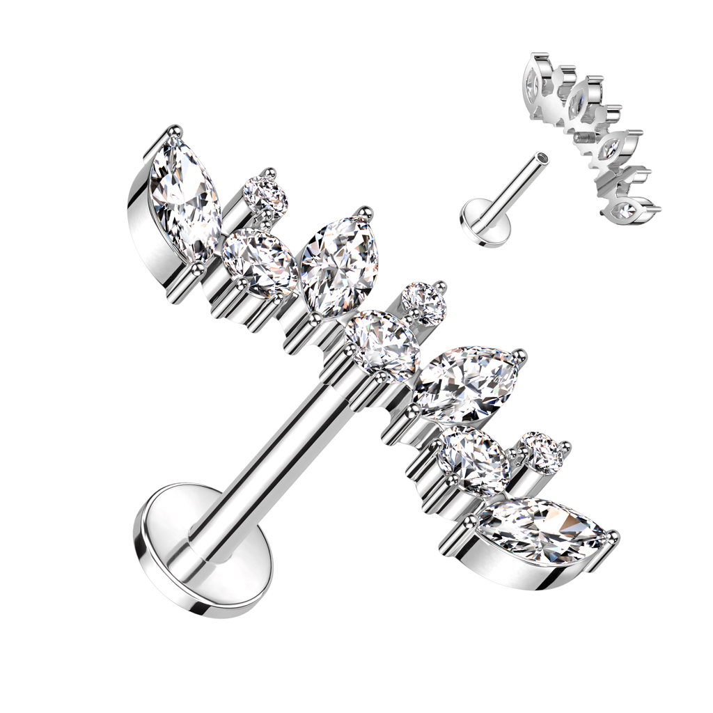 This beautiful titanium labret has alternating marquise cut and round clear stones. The curved shape of this piece is especially suitable for lobe and helix piercings, where it follows the shape of the ear.