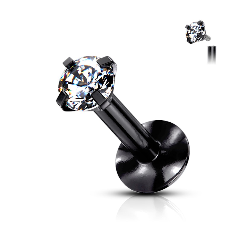 The labret is available in five different colors and features a clear stone at the top which always comes in clear color, regardless of what you choose for the structure. The stone comes in a four-prong setting, which means that is held in place by four small claws directly shaped from the post steel material to ensure the attachment. You don’t have to fear if it gets wet, as the gem is not glued.