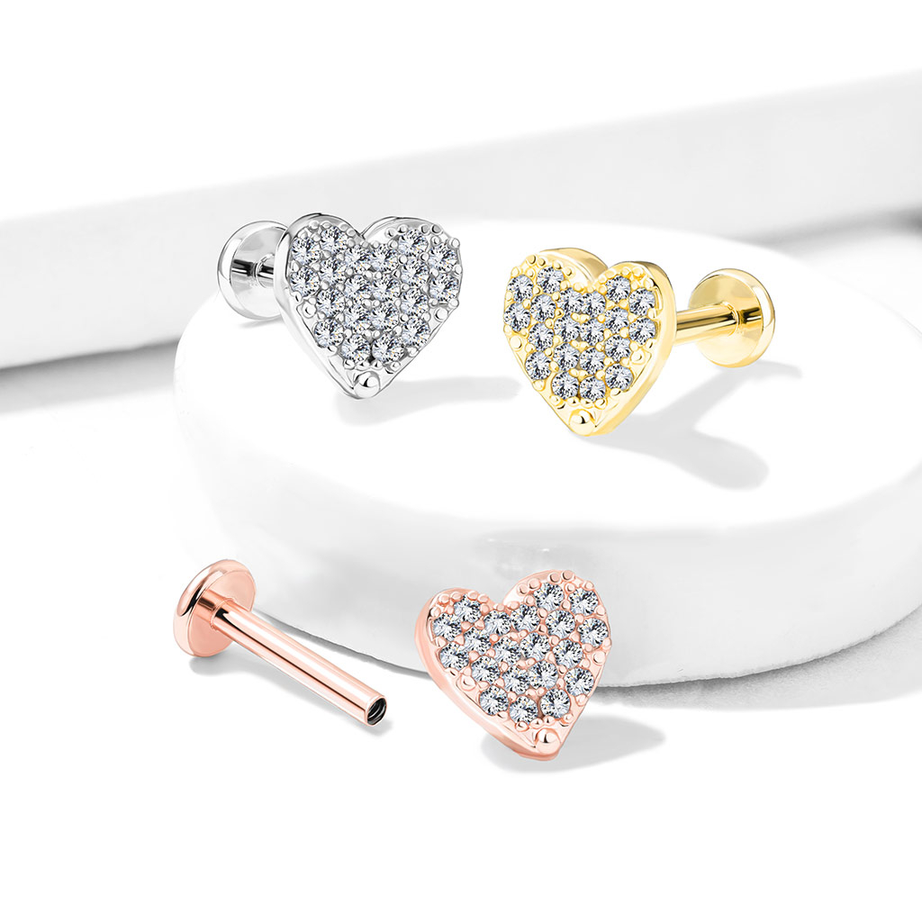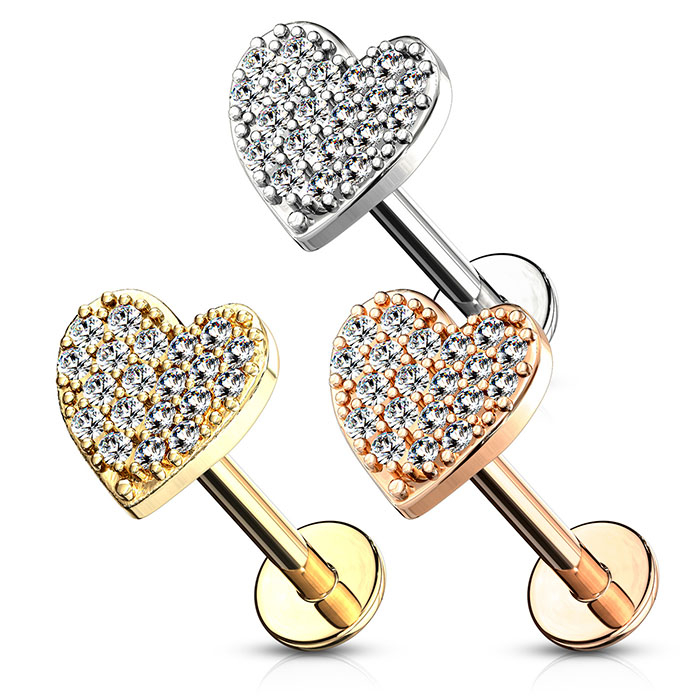 Heart designs in piercing jewelry are incredibly popular. The sweet labret you clicked on also features a heart, but with a little twist. The heart is studded with several tiny clear stones that make it shine bright.
