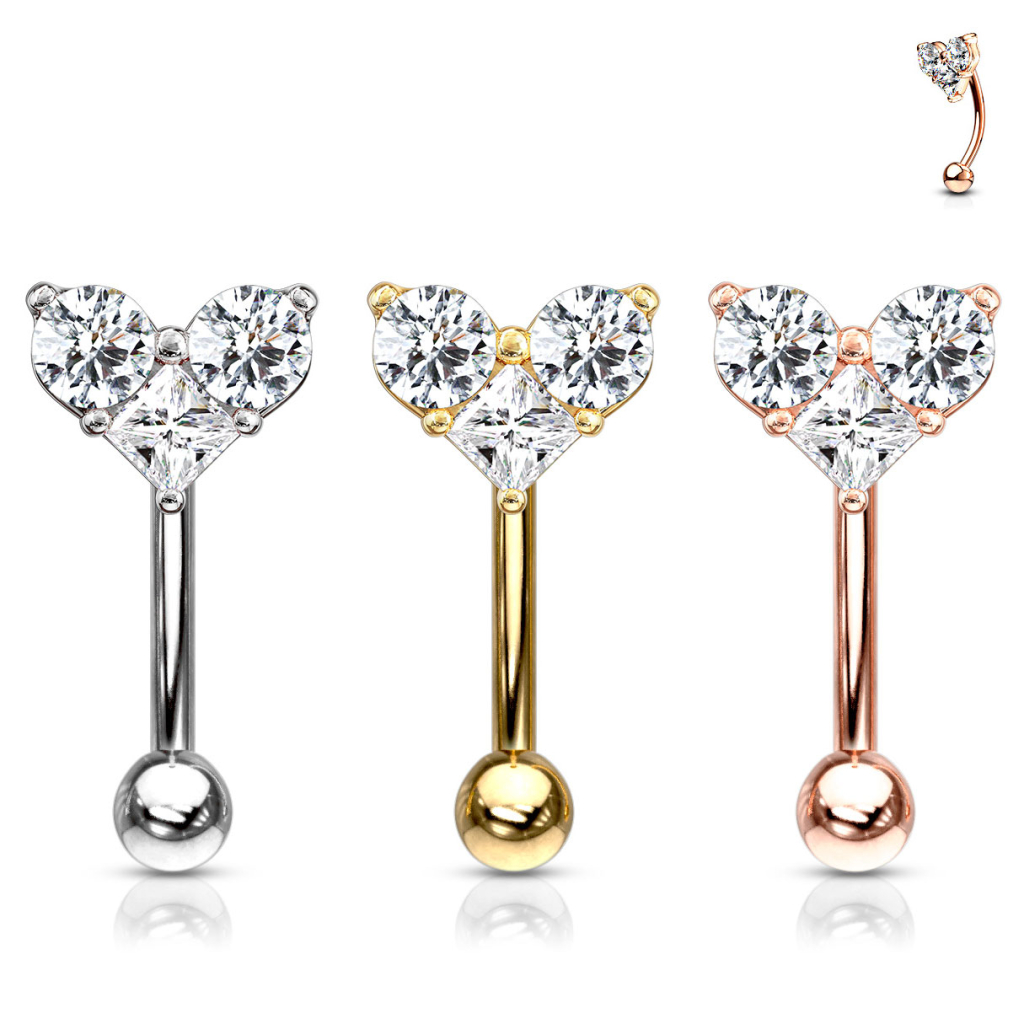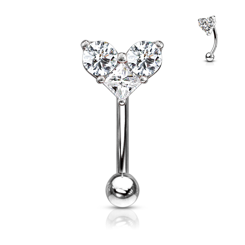 The bar is slightly curved and has a 1/8" (3 mm) end ball at the bottom. At the top, there are three little stones held by tiny brass prongs that form a heart together. Two stones are rounded, while the third one is square. With a bit of imagination, it can look like a bird with two round stone eyes and a square beak.