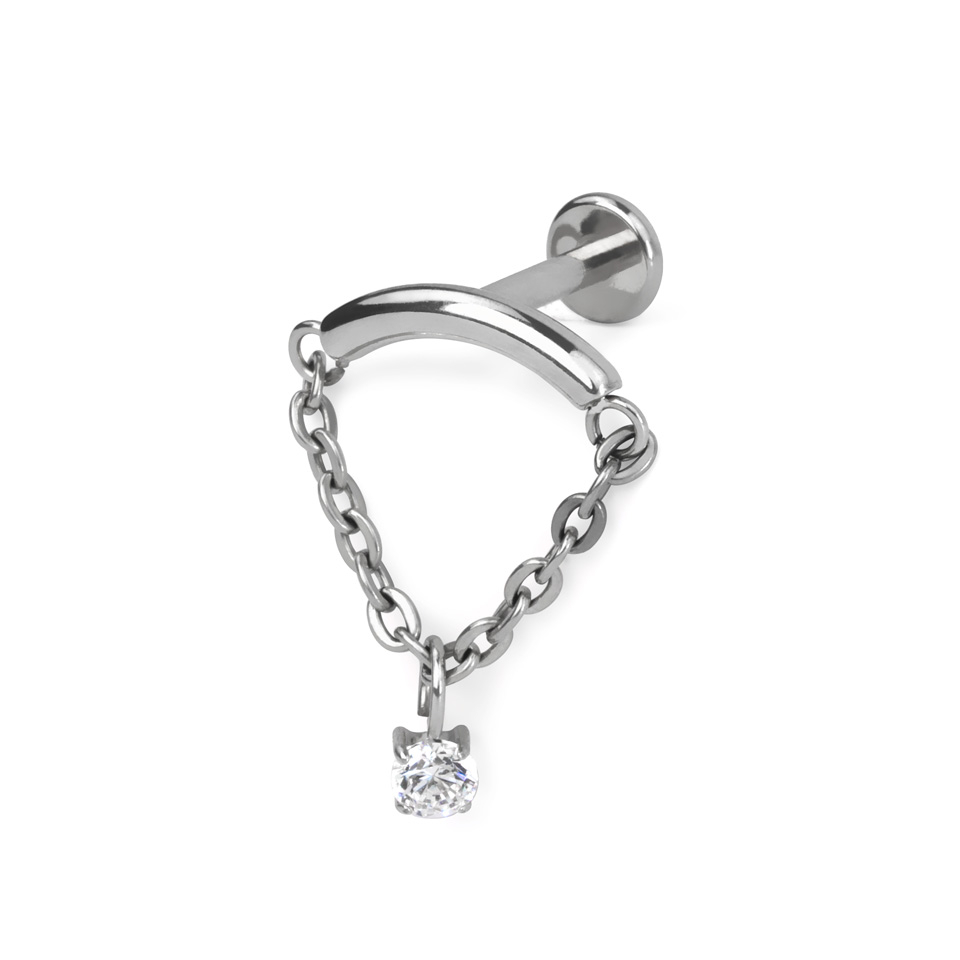 This elegant titanium labret features a curved bar with a chain that links both ends and loops underneath. Hanging from a small loop on the chain is a bezel set CZ stone. As the stone is not fixed to the center of the chain it will always hang at the lowest point, giving this piece a different effect depending how you decide to orient it in your ear. It will look great in lobe or helix piercings, alone or as part of a mix and match ensemble.