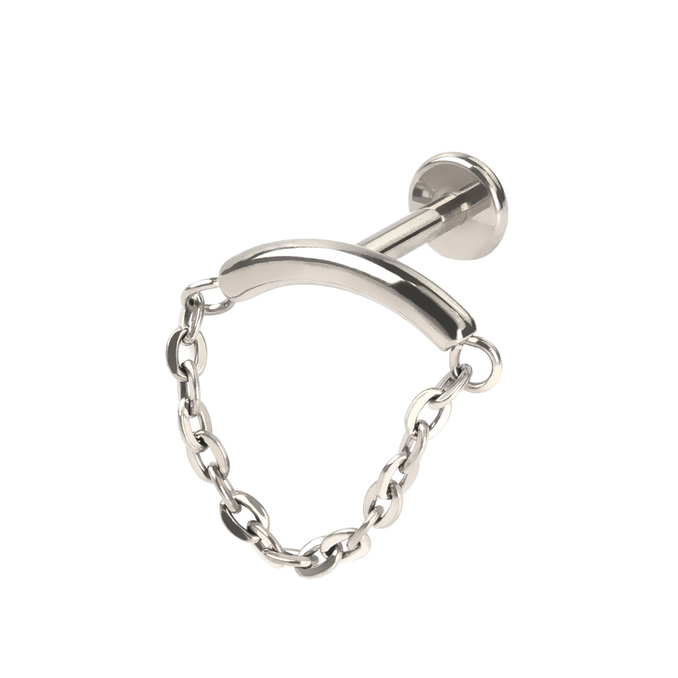 This labret features a curved bar that fits snugly into your ear if you choose to wear it in your helix piercing. It will also look great worn in the lobe. It features a delicate chain that is attached at both ends and dangles down.